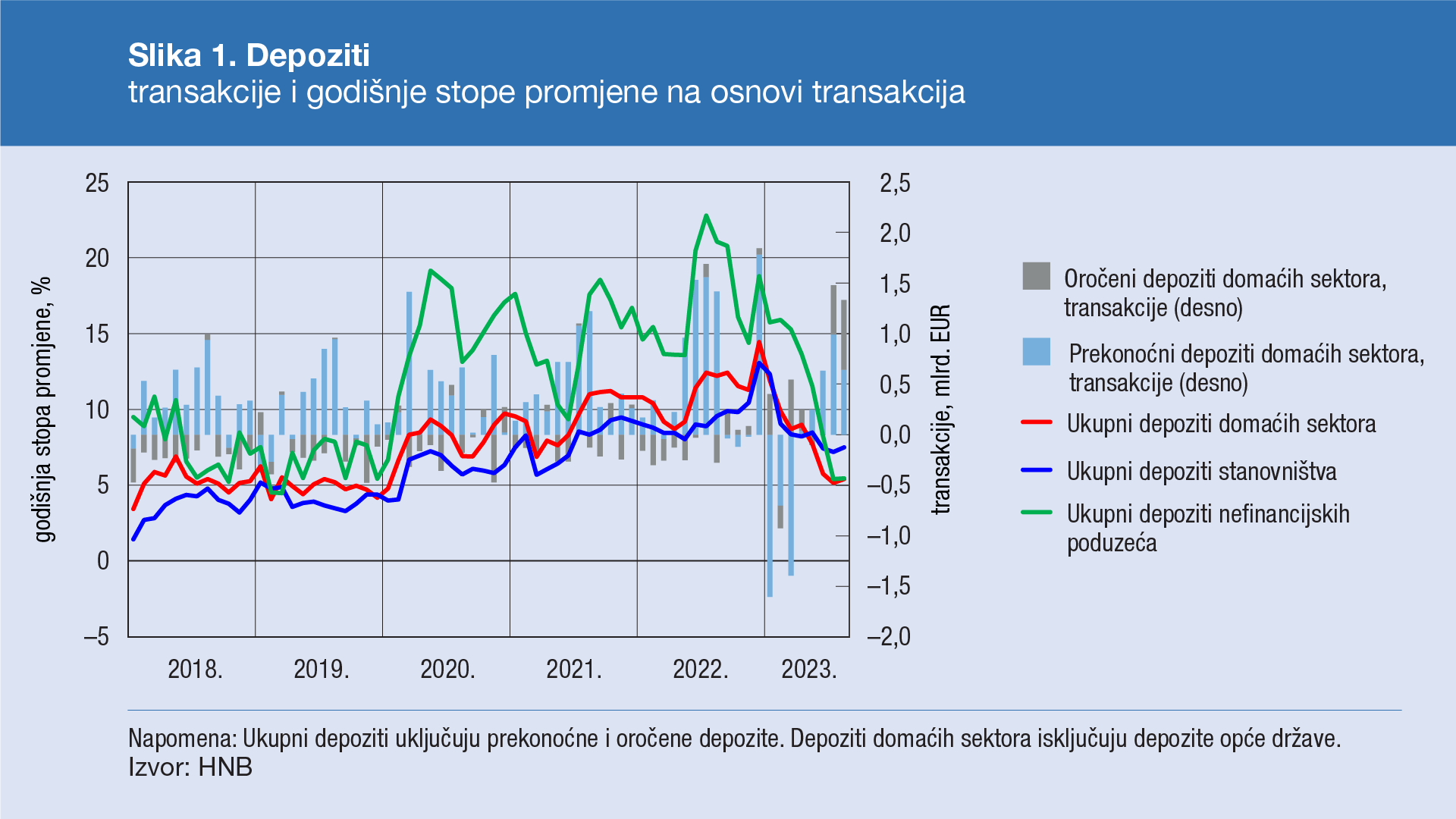 Ukupni su domaći depoziti nakon srpanjskog rasta snažno porasli i u kolovozu (za 1,3 mlrd. EUR ili 2,4%, na osnovi transakcija) kao odraz dobrih financijskih rezultata ostvarenih tijekom turističke sezone. Poduzeća su povećala depozite kod poslovnih banaka za 0,7 mlrd. EUR (0,4 mlrd. EUR oročeni i 0,3 mlrd. EUR prekonoćni depoziti), pri čemu se više od polovine tog rasta odnosilo na poduzeća koja se bave djelatnostima pružanja smještaja, posebice hotelskog i sličnog smještaja te pripreme i usluživanja hrane. Kućanstva su također ostvarila rast depozita od 0,6 mlrd. EUR (0,1 mlrd. EUR oročeni i 0,5 mlrd. EUR prekonoćni depoziti), dok su depoziti ostalih financijskih institucija samo blago porasli s obzirom na to da je rast oročenih depozita (0,2 mlrd. EUR) gotovo poništen padom prekonoćnih depozita. Na godišnjoj se razini rast ukupnih domaćih depozita ubrzao s 5,2% u srpnju na 5,4% u kolovozu (na osnovi transakcija), pri čemu je zabilježeno ubrzavanje rasta depozita stanovništva sa 7,2% na 7,5% i blago ubrzavanje rasta depozita nefinancijskih poduzeća s 5,4% na 5,5% (Slika 1.).