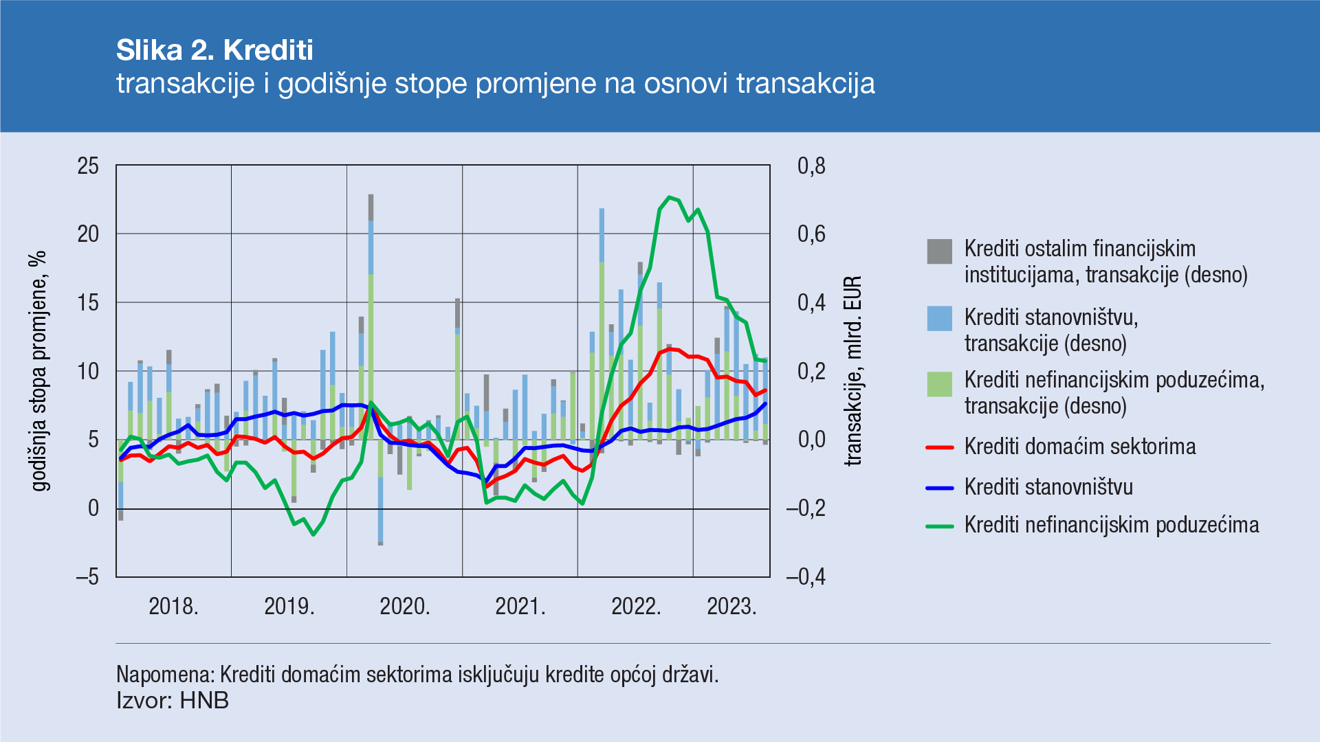 Ukupni su krediti tijekom kolovoza porasli za 224 mil. EUR ili 0,6% u odnosu na srpanj, čime je nastavljena dinamika relativno snažnog rasta kreditiranja kao i tijekom proteklih mjeseci. Rast ukupnih kredita uglavnom odražava rast kredita stanovništvu (194 mil. EUR), od čega se 124 mil. EUR odnosi na stambene kredite odražavajući i nadalje učinak državnih subvencija za stambene kredite, a 55 mil. EUR na gotovinske nenamjenske kredite. Rast kreditiranja poduzeća, iako malo izraženiji nego tijekom srpnja, i nadalje ostaje prigušen (46 mil. EUR). U strukturi kredita poduzećima rasli su udjeli u sindiciranim kreditima i u manjoj mjeri krediti za investicije[2], a smanjenje su zabilježili krediti za obrtna sredstva. Promatrano na godišnjoj razini, rast se ukupnih kredita ubrzao s 8,2% u srpnju na 8,6% u kolovozu (Slika 2.), čemu je pridonijelo izraženije ubrzavanje rasta kredita stanovništvu (sa 6,9% na 7,6%). Pritom se rast stambenih kredita ubrzao s 9,5% na 10,1%, a gotovinskih nenamjenskih kredita sa 6,8% na 7,4%. Rast kredita poduzećima blago se usporio na godišnjoj razini (s 10,8% na 10,7%) zbog učinka baznog razdoblja, odnosno malo snažnijega rasta kredita ovom sektoru u kolovozu prethodne godine.