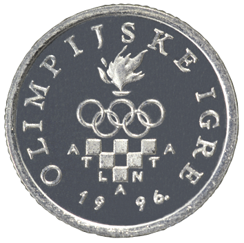 Motif on the reverse: The centre of the coin features the Croatian Olympic Committee logo, consisting of the five Olympic rings, with six relief, matte squares and three flat, shiny squares, arranged in three lines below the rings. An image of the pot with the stylised Olympic flame is featured above the Croatian Olympic Committee logo. The inscription ATLANTA" is displayed below the logo along the step-like edge of the squares. The inscription "OLIMPIJSKE IGRE" is laid out circularly along the edge of the coin. The year "1996" is inscribed centrally in the lower semi-circle next to the edge of the coin.