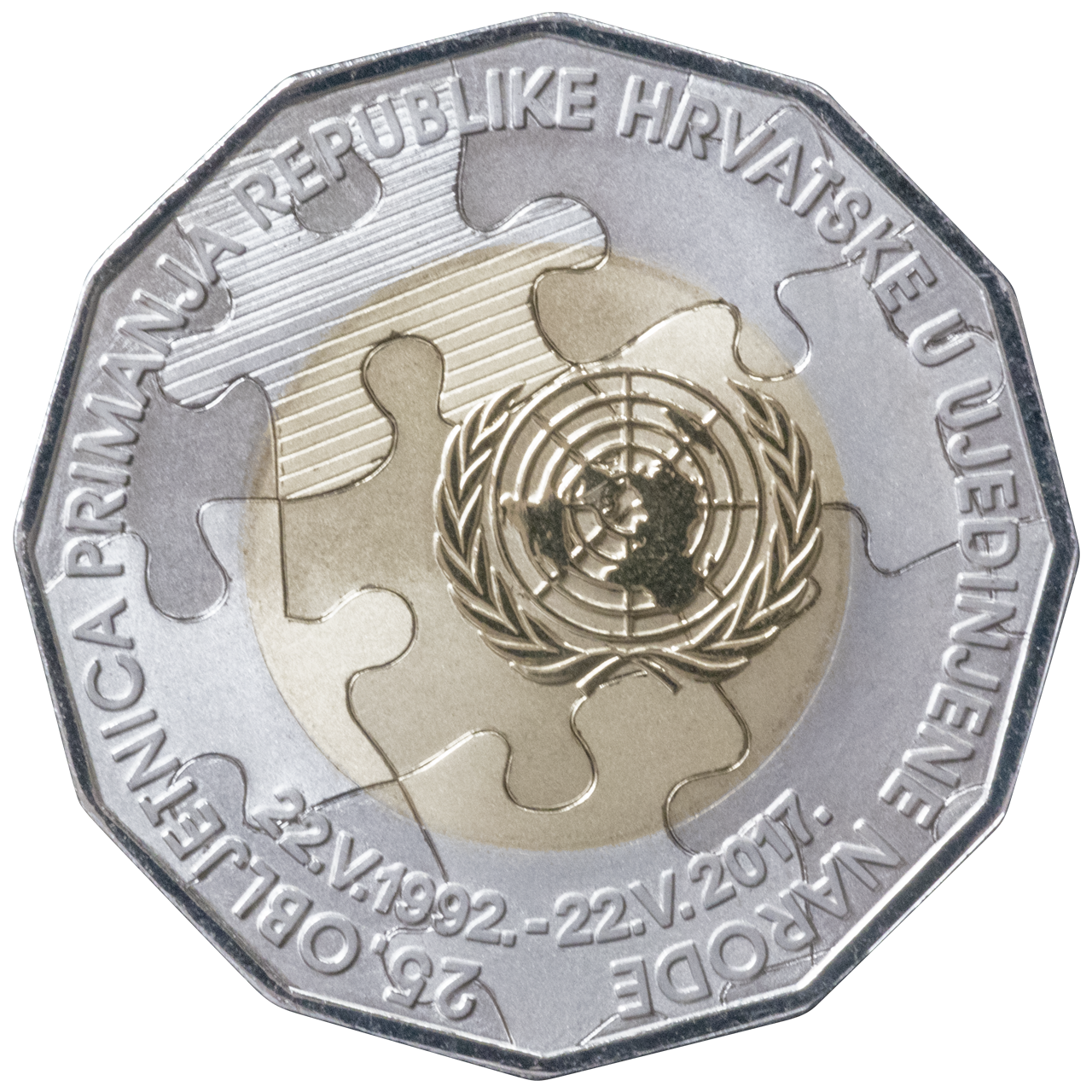 composed of matte and lustrous jigsaw pieces, one of which, crossed with diagonal lines, symbolises “H”, the first letter of the Croatian name for Croatia – “Hrvatska”. The design on the core of the coin features the logo of the United Nations touching the jigsaw piece that signifies Croatia, in a symbolic representation of Croatia’s membership in the United Nations. The jigsaw puzzle as a whole is a symbol of the cooperation and unity of the Member States of the United Nations. The legend, which in Croatian reads “25. OBLJETNICA PRIMANJA REPUBLIKE HRVATSKE U UJEDINJENE NARODE”, is inscribed in positive along the outer edge of the coin’s ring, following the circular shape of the coin. The coin’s ring also bears the dates “22. V. 1992. – 22. V. 2017.”, inscribed in positive below the core, along the ring’s inner edge.