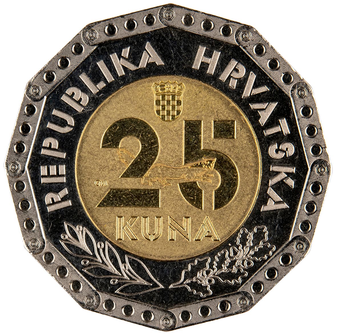 Motif on the reverse: the centre of the coin core features the stylised denomination numeral “25”. The outlines of the number “25” reveal an image of a marten turned to the right, with the marten’s body integrated with the denomination numeral. Positioned above the denomination numeral and the image of a marten, on the coin’s core surface, is an image of the coat of arms of the Republic of Croatia. The name of the monetary unit “KUNA” is inscribed below the numeral within the coin’s core. The inscription “REPUBLIKA HRVATSKA” is laid out semi-circularly above the coin’s core, on the surface of the coin’s ring. A laurel branch in bloom is positioned at the left below the coin’s core, on the coin’s ring surface. A common oak branch with acorns is positioned at the right on the coin’s ring surface. The upper edge of the ring features circularly positioned clips, which linked together make a chain, with the same symbolic message as in the description of the motif on the obverse of the coin.