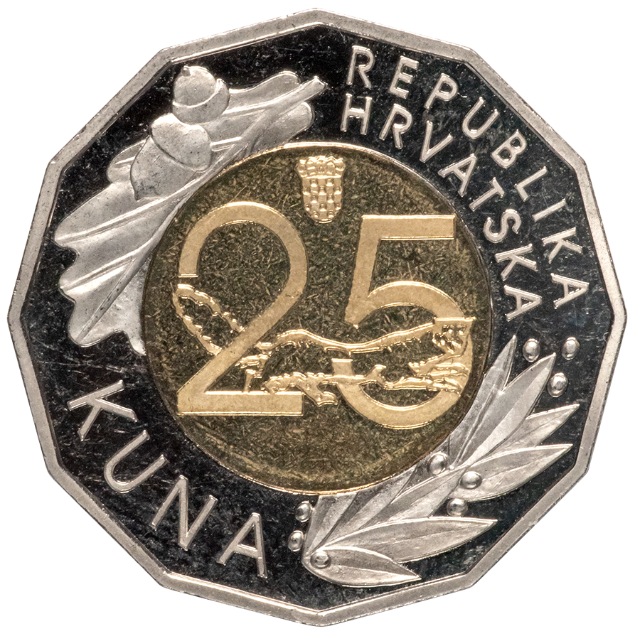 Motif on the reverse: the centre of the coin core features the denomination numeral “25”. The outlines of the number “25” reveal an image of a marten turned to the right, with the marten’s body integrated with the denomination numeral. Positioned above the denomination numeral and the image of a marten is an image of the coat of arms of the Republic of Croatia. A common oak branch with acorns is positioned at the left, above the denomination numeral on the coin’s ring surface. The top right section above the denomination numeral on the coin’s ring bears the inscription “REPUBLIKA HRVATSKA”. The name of the monetary unit “KUNA” is inscribed at the left below the numeral. A laurel branch in bloom is positioned at the right below the numeral on the ring’s surface.