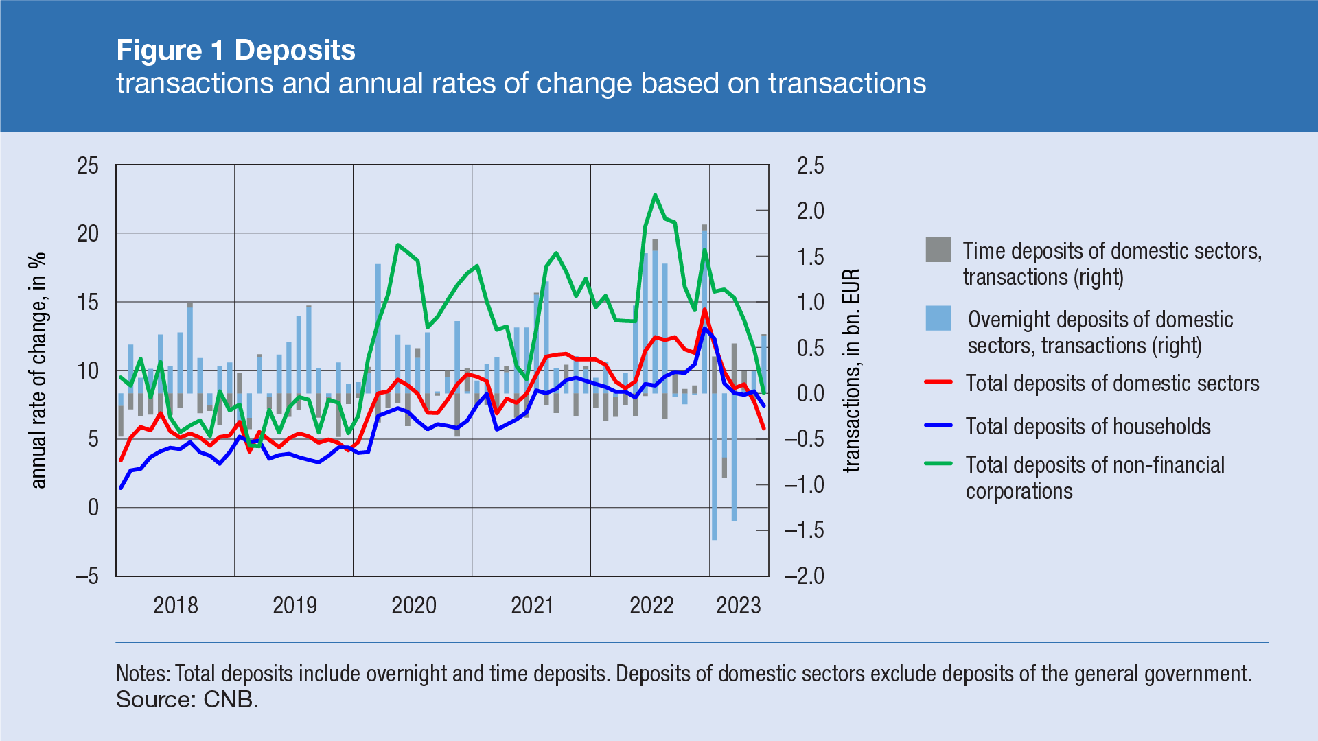 The growth in total deposits of domestic sectors picked up in June from the previous months and stood at EUR 0.6bn or 1.2% (transaction-based), driven by higher inflows from abroad at the beginning of the tourist season. In the structure of total deposits, overnight deposits rose, while time deposits remained virtually unchanged. Broken down by sector, a sharp growth in overnight deposits was recorded for non-financial corporations (EUR 0.4bn) and households (EUR 0.3bn), while overnight deposits of other financial institutions went down (EUR 0.1bn). Time deposits of non-financial corporations also increased (EUR 0.3bn), which was almost entirely offset by the decline in time deposits of other financial institutions and households by EUR 0.2bn and EUR 0.1bn respectively. On account of base effect reflecting a faster growth in June last year, the growth in total deposits of domestic sectors decelerated on an annual level, from 7.7% in May to 5.8% in June (transaction-based). The fall in deposits of other financial institutions continued to deteriorate sharply, with a slowdown in the growth of both corporate and household deposits (Figure 1).