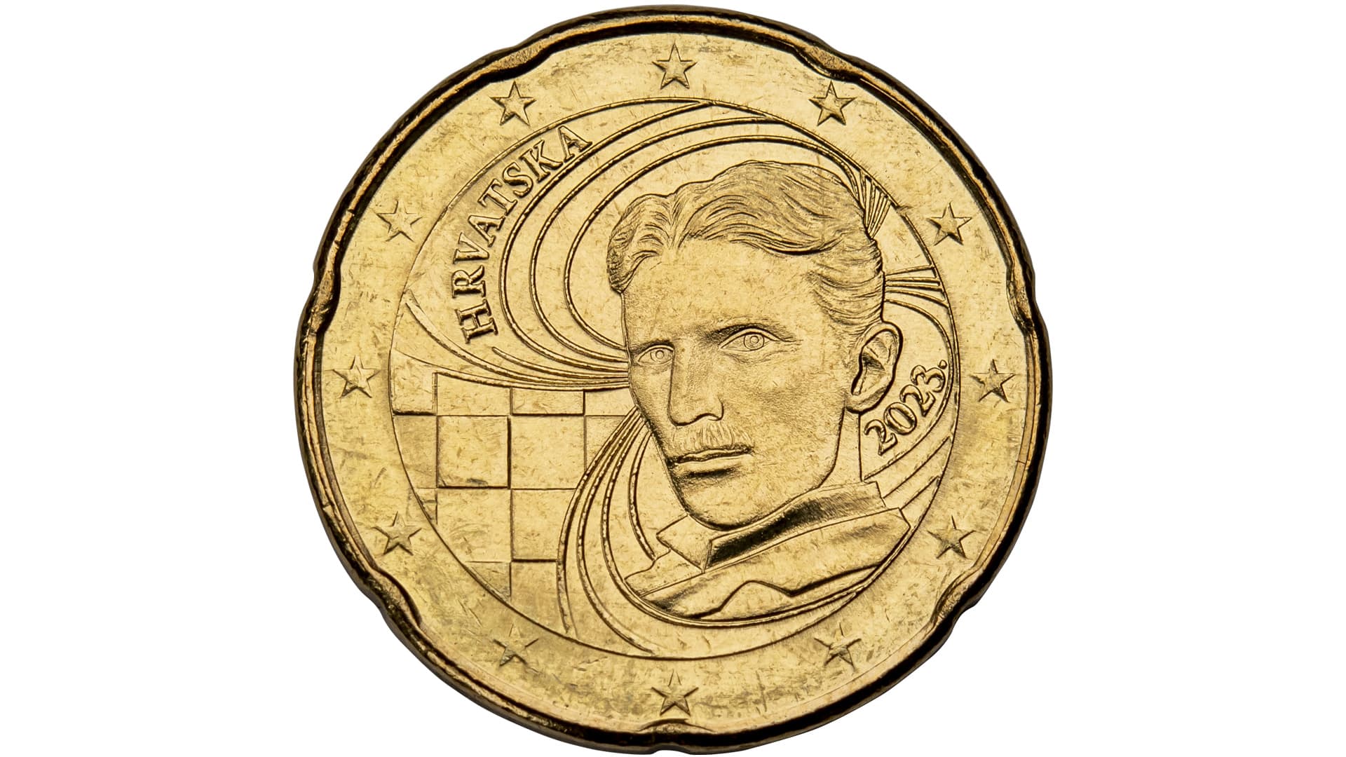 National side: The motif features a portrait of the famous scientist Nikola Tesla. A presentation of electromagnetic field lines surrounds the portrait. The bottom left segment of the coin features the Croatian checkerboard. The upper left segment of the coin features the inscription HRVATSKA.