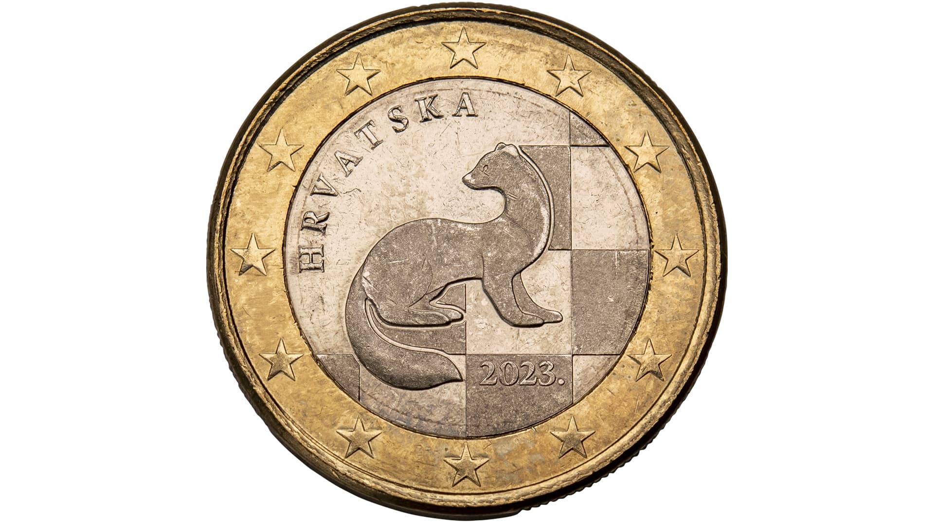 National side: The motif features a wild animal, the marten. Throughout Croatian history, the marten was a symbol of the origins of trade and goods exchange. The bottom right segment of the inner part of the coin features the Croatian checkerboard. The upper left segment of the inner part of the coin features the inscription HRVATSKA.