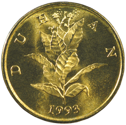 Motif on the reverse: the centre of the coin features a stylised flowering tobacco plant. The inscription "DUHAN" (Lat. NICOTIANA TABACUM) is displayed above the image, circularly along the edge of the coin. The minting year is positioned centrally along the lower edge.