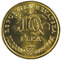 Motif on the obverse: the centre of the coin features the denomination numeral and currency name "10 LIPA" against the background showing a stylised blooming linden branch. The inscription "REPUBLIKA HRVATSKA" is displayed in the upper semi-circle along the edge of the coin. Positioned centrally along the lower edge is the coat of arms of the Republic of Croatia, bordered on its left and right sides by the Croatian wattle.