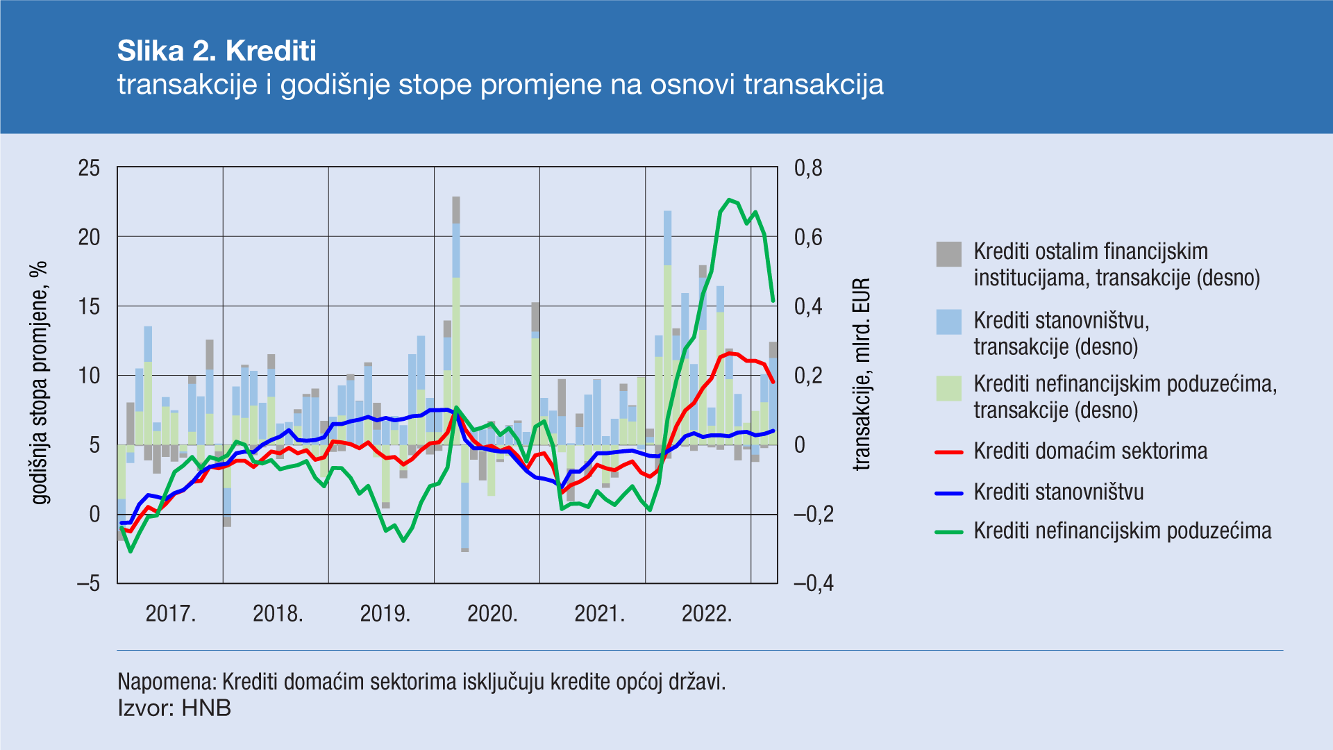 Krediti domaćim sektorima porasli su u ožujku 2023. za 0,3 mlrd. EUR ili 0,9% (na osnovi transakcija), poglavito kao odraz porasta kreditiranja stanovništva (0,2 mlrd. EUR ili 1,1%). Polovina rasta kredita stanovništvu odnosi se na gotovinske nenamjenske kredite, a blago su porasli i stambeni krediti. U idućim se mjesecima može očekivati snažniji rast stambenih kredita zbog novoga kruga državnog subvencioniranja stambenih kredita u kojemu je zaprimanje prijava za subvencioniranje započelo početkom druge dekade ožujka. Blago su porasli i krediti nefinancijskim poduzećima i ostalim nebankovnim financijskim institucijama. Pritom su kod sektora nefinancijskih poduzeća porasli krediti za investicije, a smanjili su se krediti za obrtna sredstva. Na godišnjoj razini, rast kredita nefinancijskim poduzećima usporio se s 20,1% u veljači na 15,4% u ožujku (Slika 2.), zbog učinka baznog razdoblja, odnosno znatno snažnijeg rasta kredita poduzećima u ožujku prošle godine. Kod stanovništva se godišnji rast blago ubrzao (s 5,8% na 6,0%), odražavajući ubrzanje rasta gotovinskih nenamjenskih kredita (s 3,5% na 4,3%), dok se rast stambenih kredita usporio (s 9,8% na 9,6%).