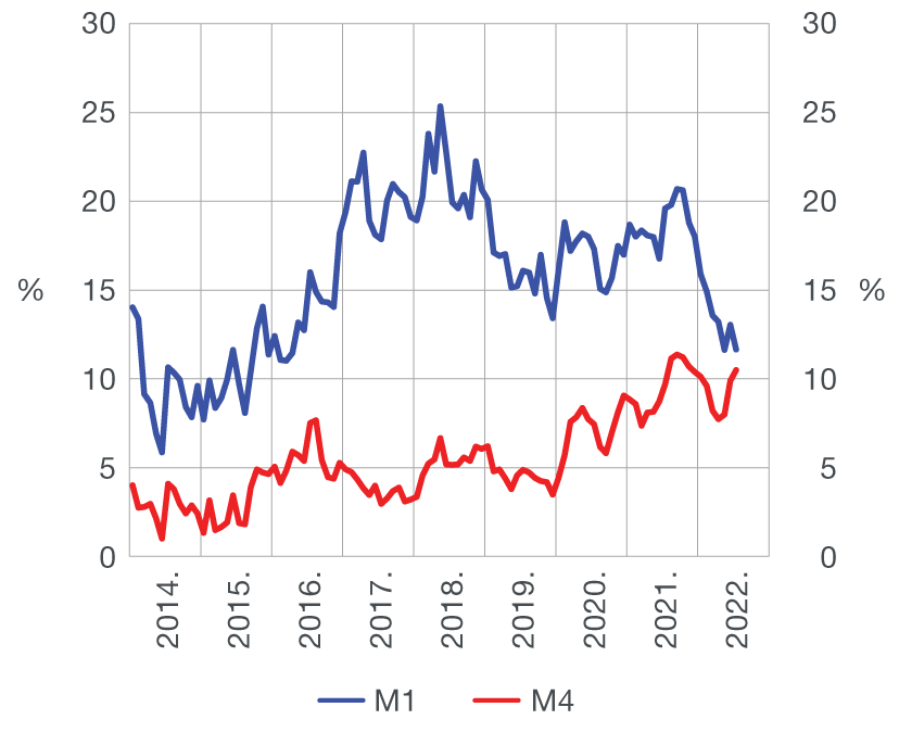 Ukupna likvidna sredstva (M4[1]) zabilježila su u srpnju dosad najviši apsolutni mjesečni rast (13,4 mlrd. kuna, na osnovi transakcija), što je u prvom redu odraz povećanja neto inozemne aktive (NIA) kreditnih institucija te u manjoj mjeri neto domaće aktive (NDA) monetarnog sustava (Tablica 1.). Rast NDA-a odnosi se na snažan rast plasmana domaćim sektorima, posebice nefinancijskim poduzećima, a porasla su i neto potraživanja od središnje države, što je povezano s bankovnim kupnjama obveznice RH izdane u srpnju. Novčana masa (M1[2]) također je izrazito porasla u srpnju (7,2 mlrd. kuna ili 3,6%, na osnovi transakcija) odražavajući ponajviše rast depozitnog novca nefinancijskih poduzeća i nešto slabiji rast depozitnog novca stanovništva. Kvazinovac je zabilježio porast od 6,3 mlrd. kuna ili 2,8% (na osnovi transakcija), pri čemu se u njegovoj strukturi intenzitetom izdvojio rast deviznih depozita svih domaćih sektora (Tablica 3.). Promatrano na godišnjoj razini, ukupni depoziti porasli su za 12,4% (na osnovi transakcija), pri čemu su snažan rast zabilježili i depoziti poduzeća (22,7%) i stanovništva (8,9%) pod utjecajem vrlo dobrog početka turističke sezone, povećanih potreba za likvidnosti poduzeća iz energetskog sektora, što se može povezati s izraženim poskupljenjem energenata, te konačno znatnom dokapitalizacijom jednog poduzeća iz lipnja ove godine. Kada je riječ o godišnjim promjenama monetarnih agregata, rast M4 nastavio se ubrzavati (s 9,9% u lipnju na 10,5% u srpnju), dok se rast M1, zbog većega mjesečnog porasta u srpnju prethodne godine (učinak baznog razdoblja), usporio s 13,0% na 11,7% (Slika 1.).