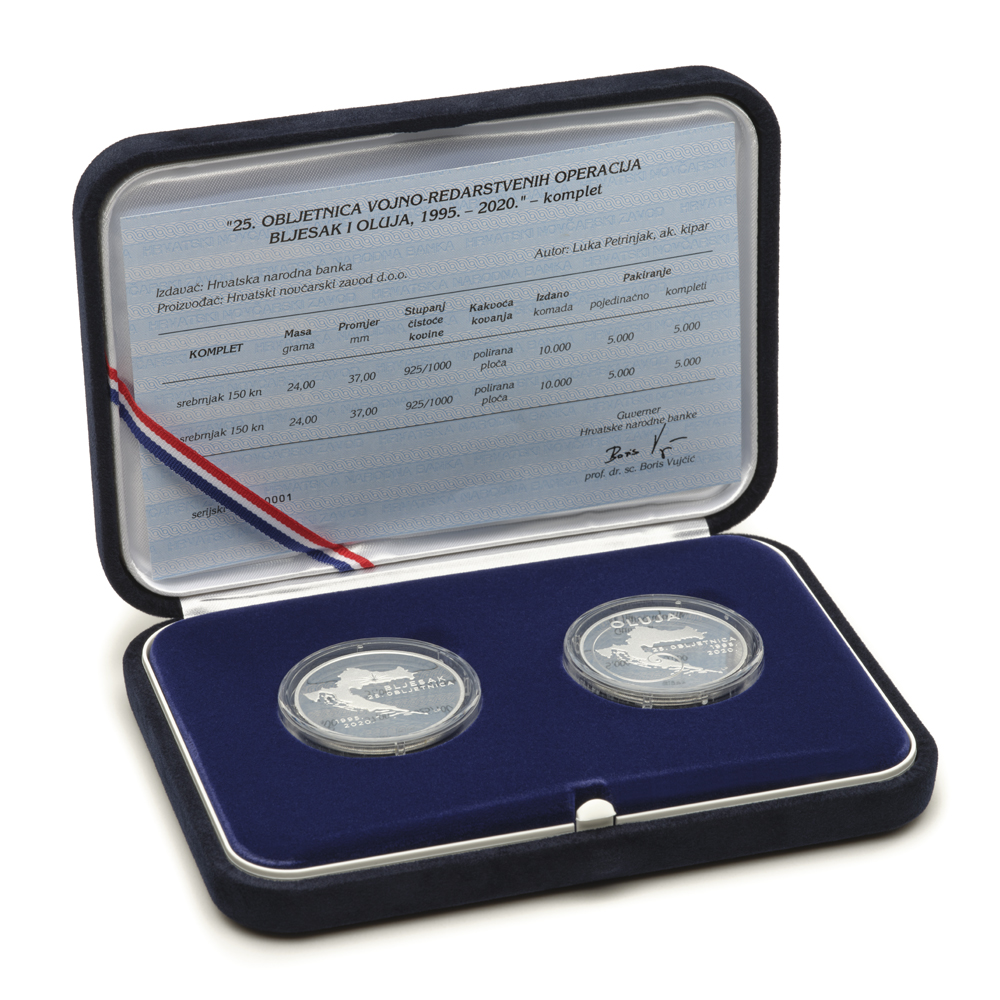 Srebrnjak "25. OBLJETNICA VOJNO-REDARSTVENE OPERACIJE OLUJA, 1995. – 2020." izdaje se i u kompletu sa srebrnjakom "25. OBLJETNICA VOJNO-REDARSTVENE OPERACIJE BLJESAK, 1995. – 2020." prema tehničkim obilježjima i izdanim količinama u nastavku.